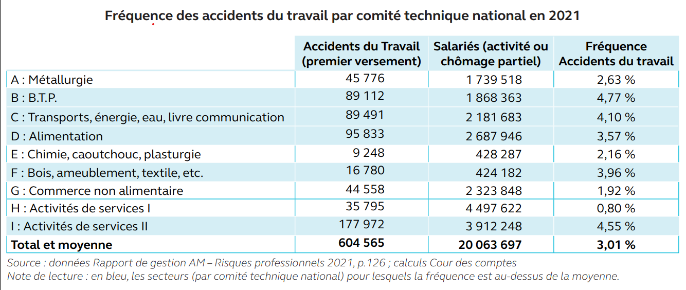 - La tarification est profitable aux secteurs générant le plus de risques professionnels : « les écarts en termes de fréquences d’accidents vont de 1 à 6 selon les comités techniques nationaux (de 0,80% pour les activités de service I à 4,77% pour le BTP) tandis que ceux en termes de taux de cotisation ne vont que de 1 à 4 (de 1,03% à 4,26% en 2021) ».