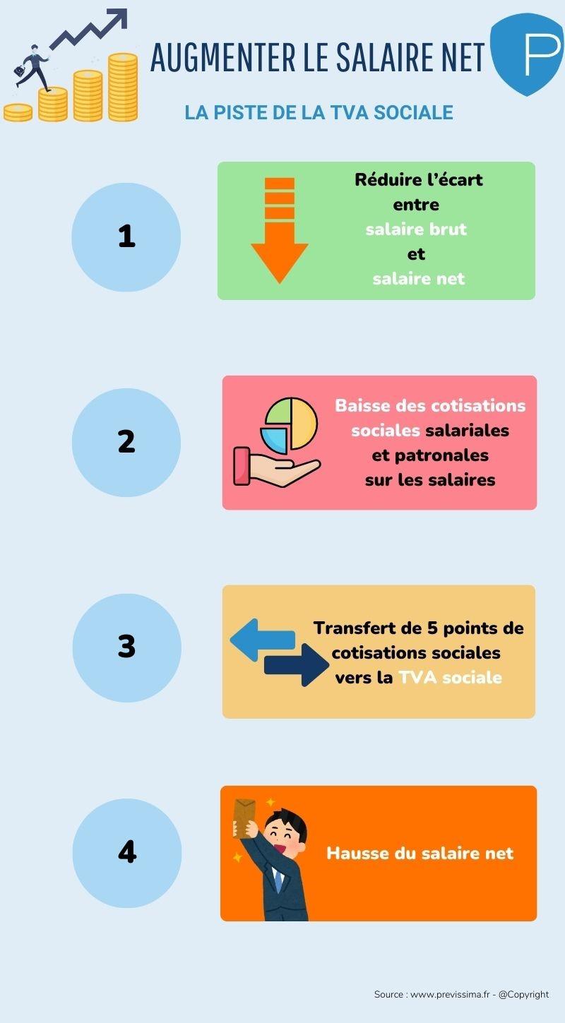 Le patron de Bercy souhaite réduire l’écart entre le salaire but et le salaire net grâce au dispositif de TVA sociale. On procéderait par une bascule de 5 points de cotisation sociale vers cet impôt général sur la consommation directement facturé aux clients sur les biens qu'ils consomment ou les services qu'ils utilisent en France. Bruno Le Maire, chiffre le coût d’une telle mesure à 60 milliards d’euros. Seraient ciblés par le dispositif les salariés de la classe moyenne touchant entre 2 000 € et 3 000 €/mois.