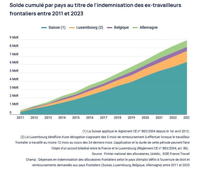 À la longue, ce manque à gagner pèse sur le régime : en cumul depuis 2011, les dépenses liées aux frontaliers représentent 11,2 milliards d’euros à la fin de l’année 2023, pour seulement 2,2 milliards de compensation.