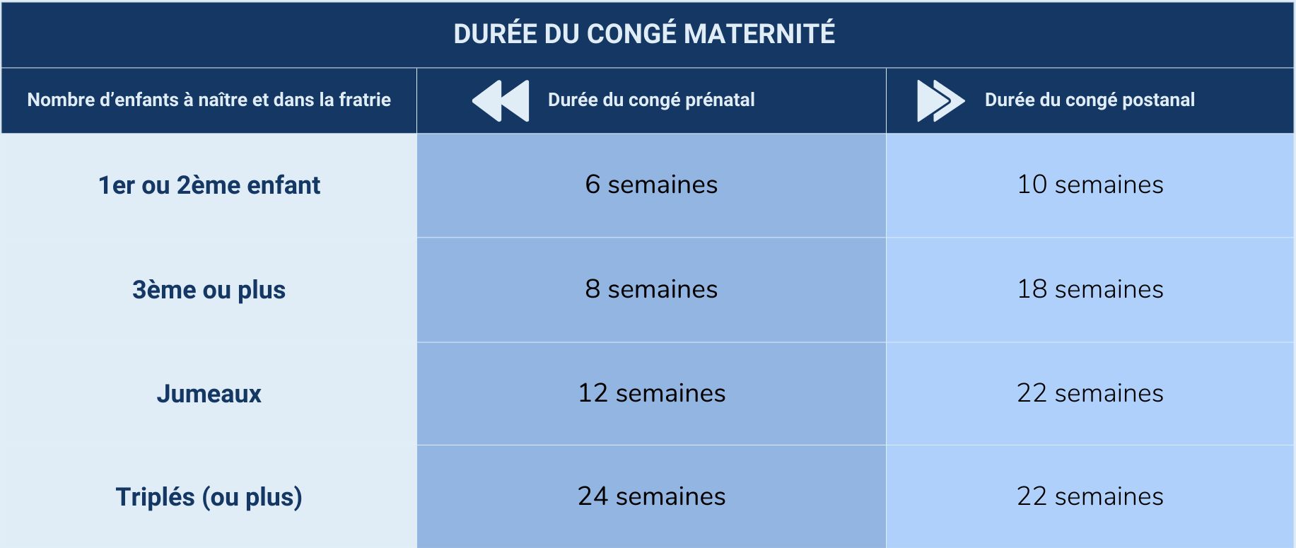 La durée légale de congé maternité varie en fonction du nombre d’enfants dans le foyer, et en cas de grossesse multiple :