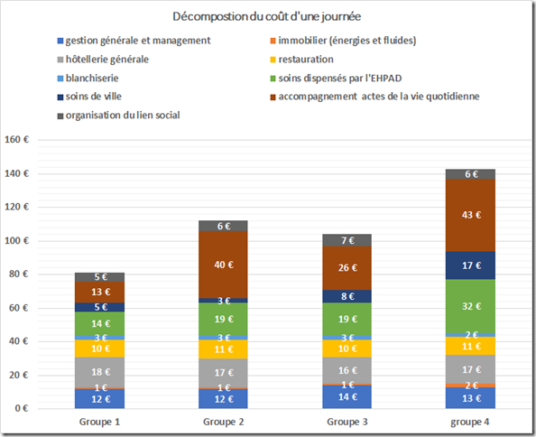 Il ne s’agit pas du coût facturé aux résidents, mais de la décomposition du coût journalier selon les différentes activités : soins dispensés, accompagnement dans les actes de la vie quotidienne, organisation du lien social, restauration, blanchisserie, hôtellerie générale.
