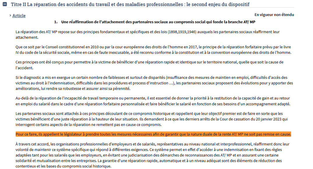 Les partenaires sociaux, dans un ANI du 15 mai 2023 relatif aux AT-MP, avaient alors demandé au législateur de « prendre toutes les mesures nécessaires pour garantir que la nature duale de la rente AT/MP ne soit pas remise en cause ».