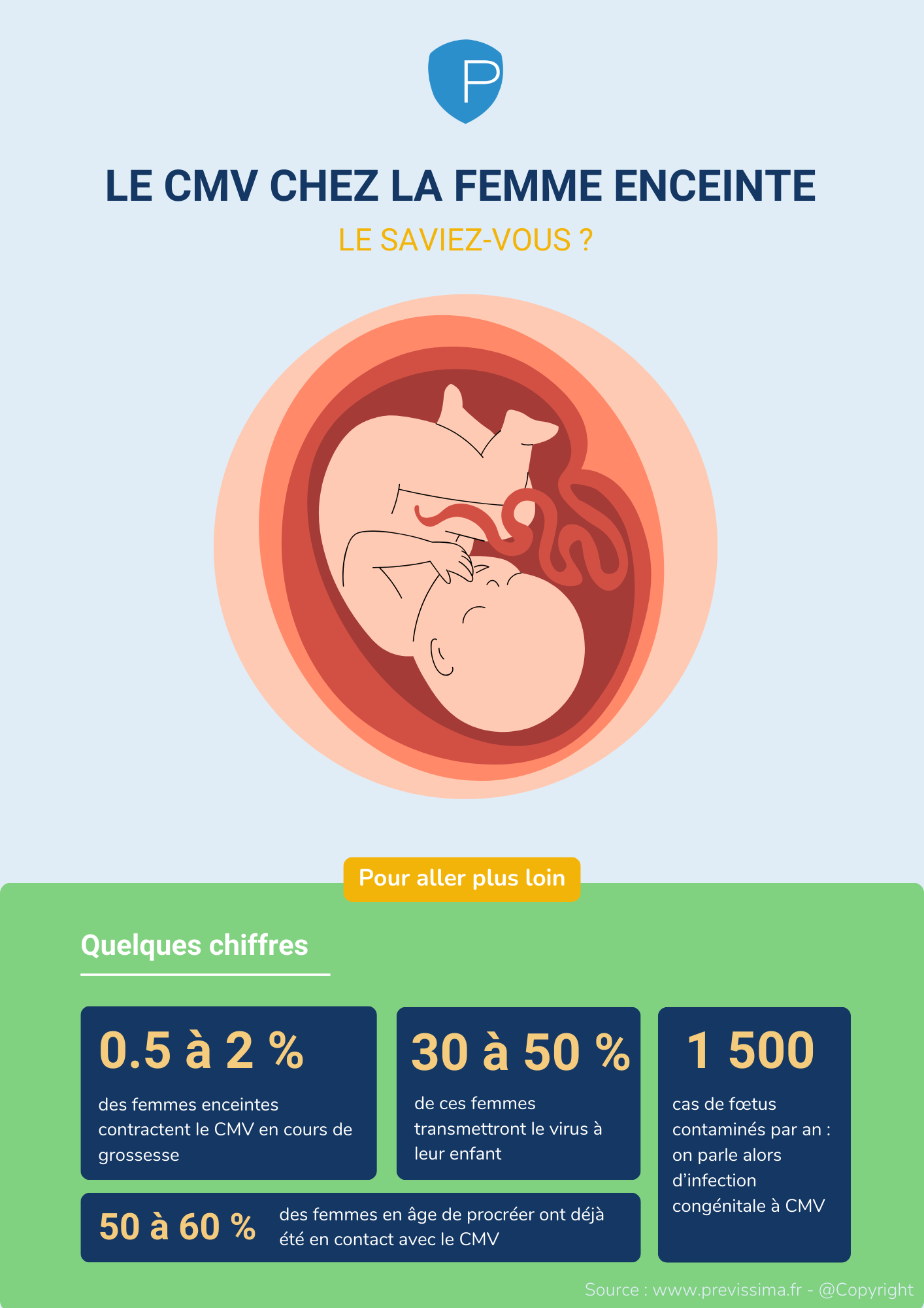 Vous l’aurez donc compris, l’infection de la mère au CMV pendant la grossesse n’est a priori pas grave pour elle-même. En revanche, c’est pour le fœtus qu’il existe des risques importants, particulièrement si l’infection se produit durant les 3 premiers mois de grossesse.