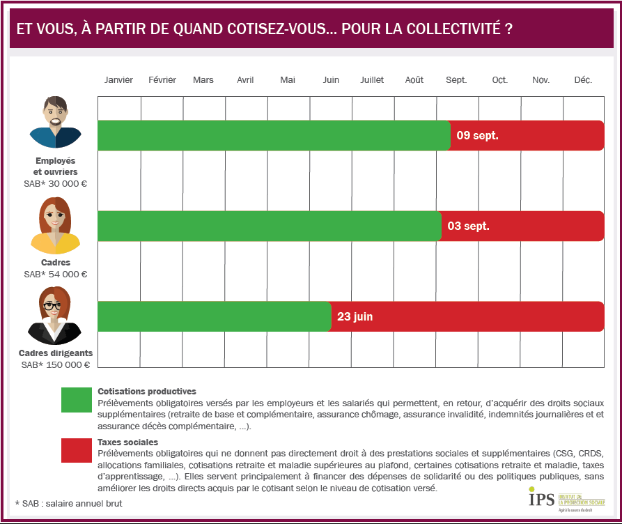 Et plus le salaire grimpe, plus le phénomène s’accentue : pour un revenu de 40 000 € annuel, 69 % des cotisations sont productives, contre seulement 53 % pour un revenu à 100 000 €. Pour les plus hauts revenus, cette part grimpe même à 100 %. Ainsi, « dans le meilleur des cas, à partir du 9 septembre, les cotisations sociales ne bénéficient plus à ceux qui les paient » explique ainsi le communiqué de presse de l’étude.