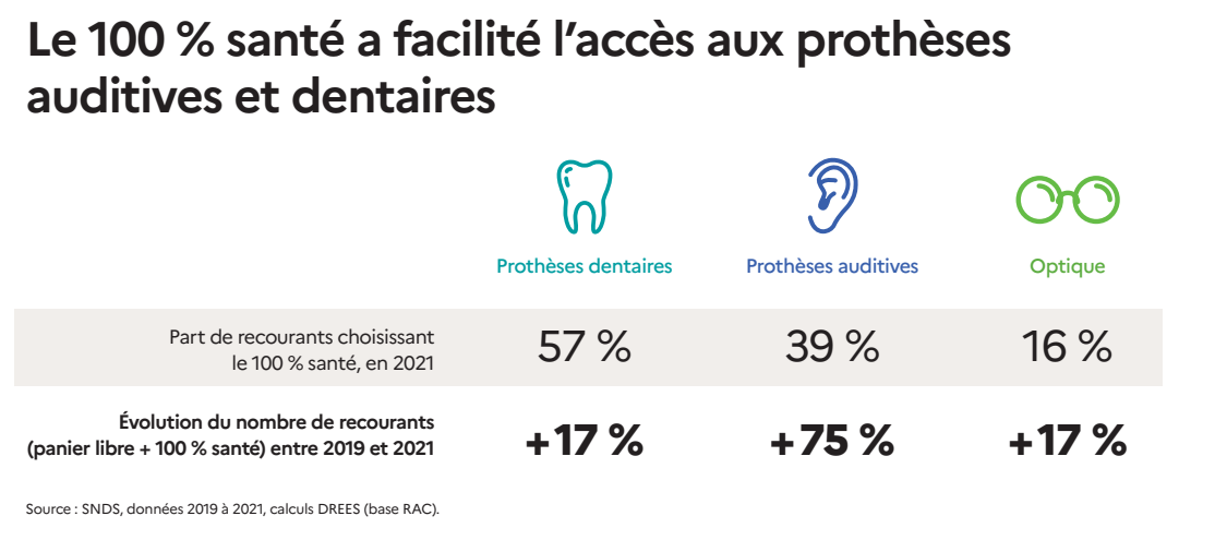 - le nombre de personnes ayant acheté des prothèses auditives a bondi de 75 % entre 2019 et 2021. Sur ce total, 40 % des personnes ont choisi un bien du panier 100 % santé en 2021 ;