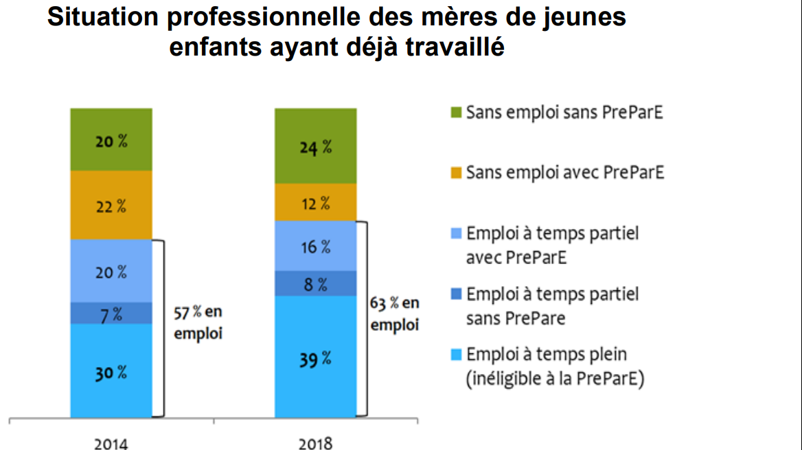 En parallèle, le raccourcissement de la durée d’indemnisation a augmenté la probabilité pour les mères d’occuper un emploi à court comme à moyen terme selon les statistiques publiés par la direction de la recherche, des études, de l’évaluation et des statistiques (DREES).