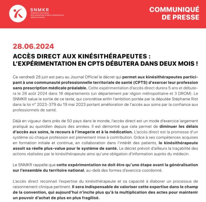 Un décret d’application publié au Journal officiel du 28 juin 2024 autorise à titre expérimental, pour 5 ans, les masseurs-kinésithérapeutes exerçant au sein d’une communauté professionnelle territoriale de santé (CPTS) à travailler sans prescription médicale. Ces séances en accès direct sont limitées à 8 par patient, dans le cas où celui-ci n'aurait pas eu de diagnostic médical préalable, dans le cas contraire, il n’y a pas de limitation du nombre de séances.