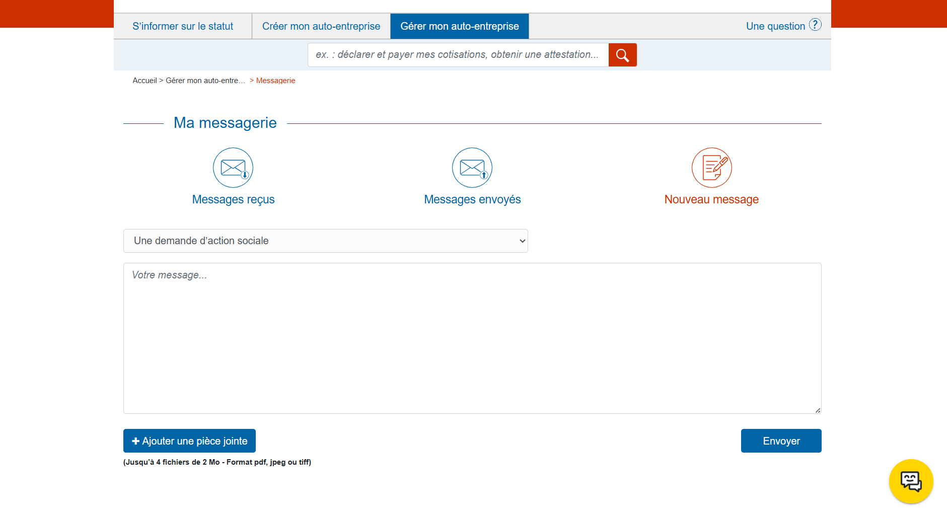 - Pour les auto-entrepreneurs, « Nouveau message » → « Une demande d’action sociale ».