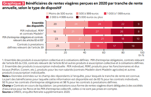 Malgré cette hausse, la part de la retraite surcomplémentaire demeure marginale dans le paysage Français : les cotisations de retraite supplémentaire représentent environ 5 % de l’ensemble des cotisations (régimes publics légalement obligatoires et dispositifs facultatifs confondus). Quant aux prestations, qui ont bénéficié à 2,6 millions de personnes, elles se stabilisent à 2,1 % de l’ensemble des prestations de retraite versées. Ces dernières sont d'ailleurs très majoritairement versées sous forme de rente viagère : 2,4 millions de retraités en sont bénéficiaires en 2020. Parmi eux :