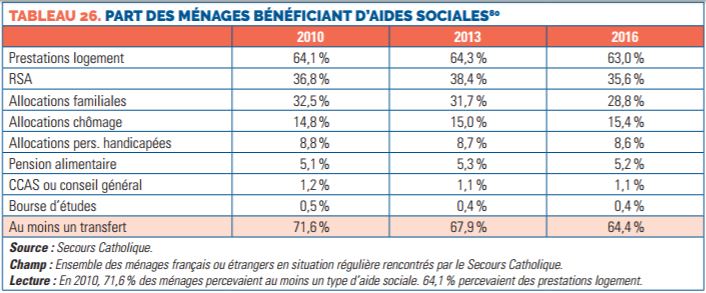 En 2016, 64,4 % des ménages aidés par le Secours Catholique perçoivent au moins une aide sociale de l’État. Cette proportion est en baisse par rapport à 2010 et à 2013. D’après l’association, cette baisse s’expliquerait par une diminution du nombre de ménages percevant des allocations familiales et, dans une moindre mesure, d’une baisse du recours aux aides au logement.