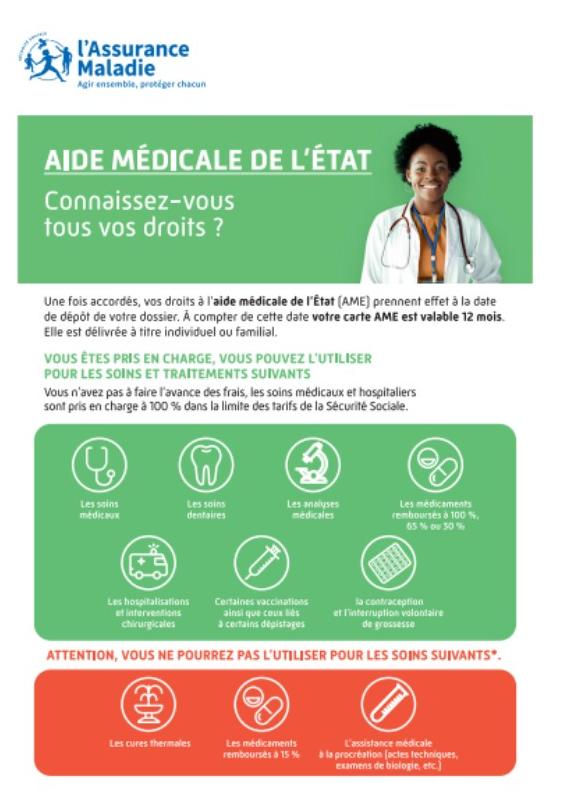 L’Aide médicale d’État (AME) est un dispositif d’accès aux soins gratuit pour les étrangers en situation irrégulière. L'obtention de l'Aide médicale d’État est soumise à des conditions de justification d’identité, de résidence stable et ininterrompue en France depuis 3 mois et de ressources.