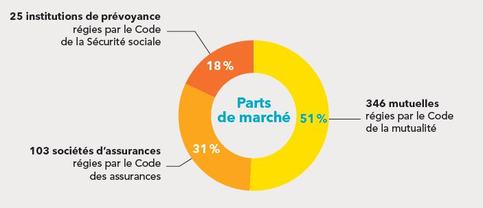 L’assurance maladie complémentaire est essentiellement gérée par des acteurs privés, les mutuelles, les sociétés d’assurance et les instituts de prévoyance. Ces 3 types d’organismes se partagent le marché avec 51 % de parts de marché détenues par les mutuelles.