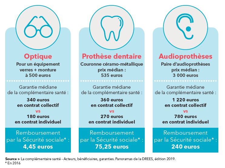 En ce qui concernent les trois secteurs impactés par la réforme du 100 % santé, optique, dentaire et audioprothèse, les chiffres de la DREES de 2016 montrent un net avantage du remboursement pour les contrats collectifs par rapport aux contrats individuels. Ainsi, le prix d’une couronne céramo-métallique est en moyenne de 535 € sur lesquels les contrats collectifs remboursent en moyenne 360 € contre 270 € pour un contrat individuel.