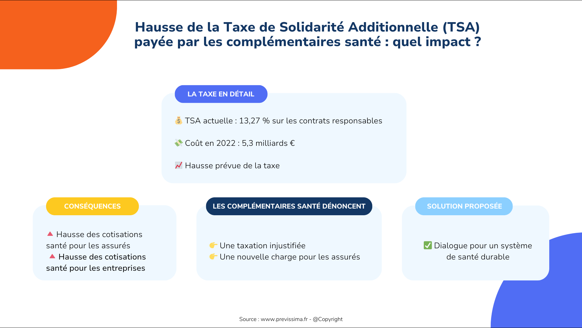 Les cotisations perçues par les complémentaires santé sont soumises à la TSA, dont le taux varie en fonction du type de contrats d’assurance. Pour les contrats responsables, qui représentent l’immense majorité du marché, la taxe s’élève à 13,27 %. En 2022, la TSA a coûté 5,3 milliards d’euros, soit 13,3 % du montant total des cotisations santé hors taxe collectées par les organismes.