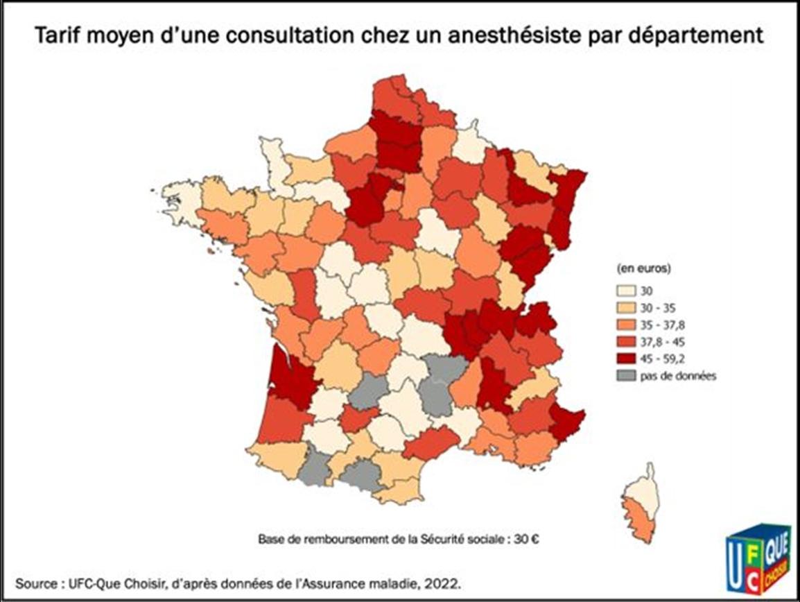 À titre d’illustration, les honoraires des anesthésistes varient du simple au double selon le département, et présentent un contraste tarifaire saisissant entre les départements les moins chers et les plus chers :