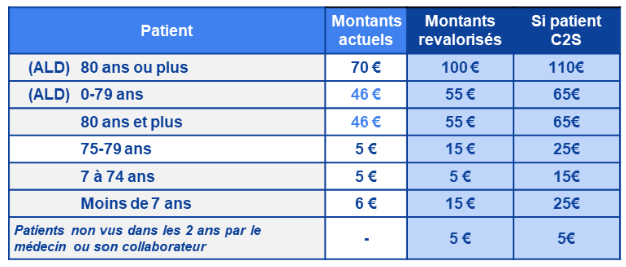 - Il sera, par exemple de 100 euros pour un patient de plus de 80 ans en affection de longue durée (ALD) ;