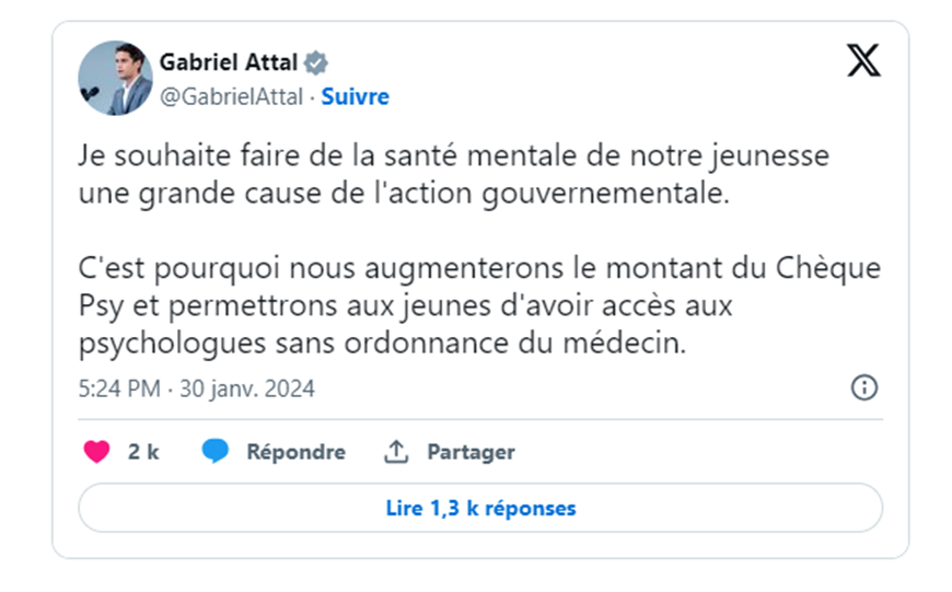 Préoccupé par la dégradation de la santé mentale chez les jeunes, le Premier ministre Gabriel Attal a annoncé samedi soir vouloir faire évoluer le dispositif Mon Soutien Psy.