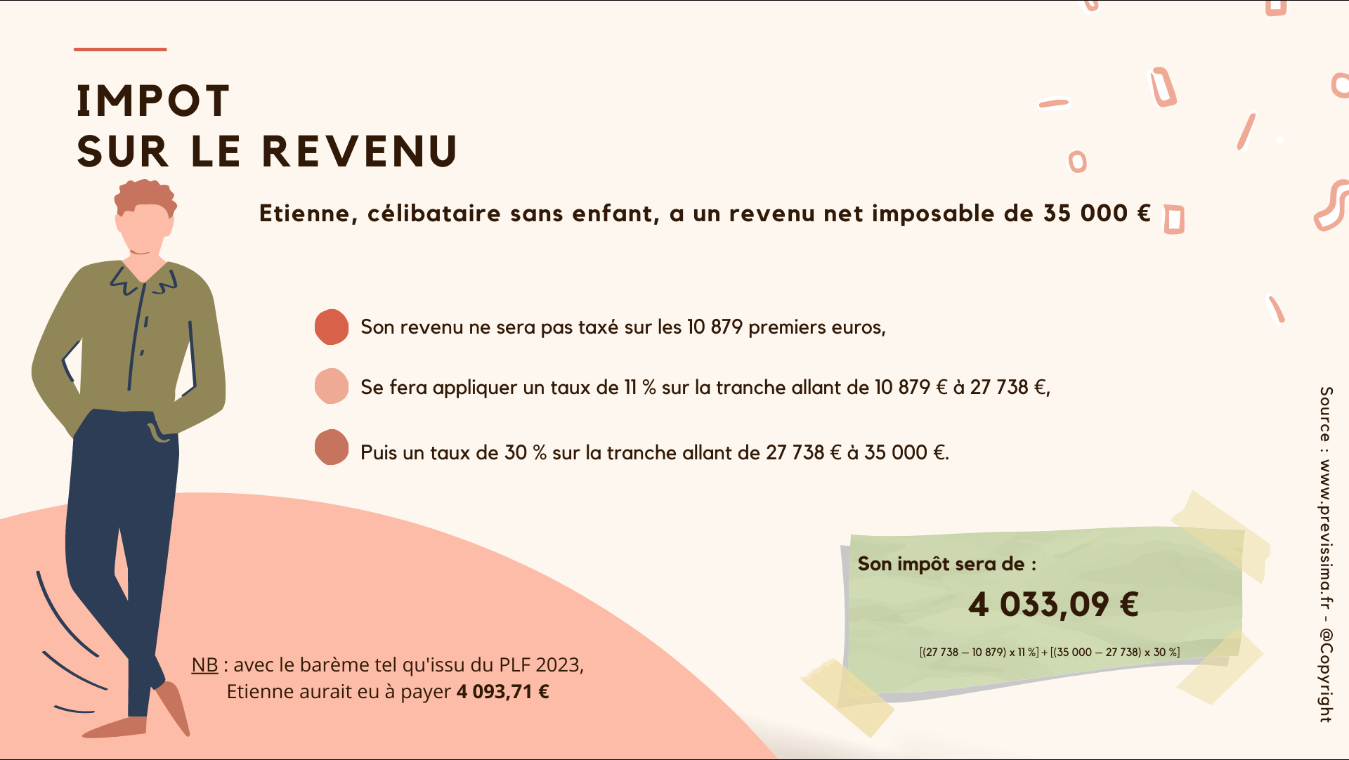 Etienne, célibataire sans enfant, a un revenu net imposable de 35 000 €. Son impôt sur le revenu sera progressif : il ne sera pas taxé sur les 10 879 premiers euros, se fera appliquer un taux de 11 % sur la tranche allant de 10 879 € à 27 738 €, puis un taux de 30 % sur la tranche allant de 27 738 € à 35 000 €.
