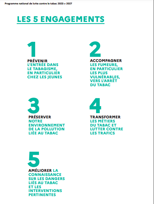 Le Programme national de lutte contre le tabagisme (PNLT) pour 2023-2027, présenté il y a quelques jours, s’articule autour de 5 axes principaux, parmi eux :