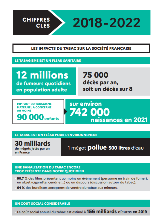 - 1,9 millions de fumeurs en moins en 2018 chez les 18-75 ans grâce aux mesures du Programme national de lutte contre le tabagisme 2018-2022.