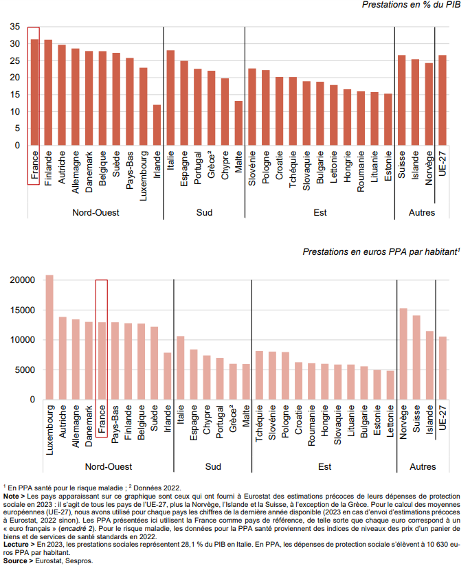 S’agissant des pays du Sud se trouvent à des niveaux intermédiaires en matière de parts de PIB (13,2 % à Malte, 28,1 % en Italie), mais se rapprochent des pays d’Europe de l’Est en dépense par habitant (5 970 € à Malte, 10 630 € en Italie).