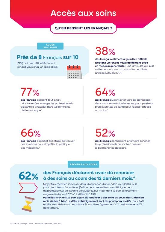 Ces évolutions sont nécessaires pour lutter contre l’accès aux soins : 62% des Français déclarent avoir dû renoncer à des soins de santé au cours des 12 derniers mois, principalement en raison des délais d'attente (53%) et 68 % des Français considèrent qu’il faut totalement réorganiser notre système de santé. Enfin, 77% des Français estiment prioritaire d'encourager les professionnels de santé à s'installer dans les territoires où il en manque.