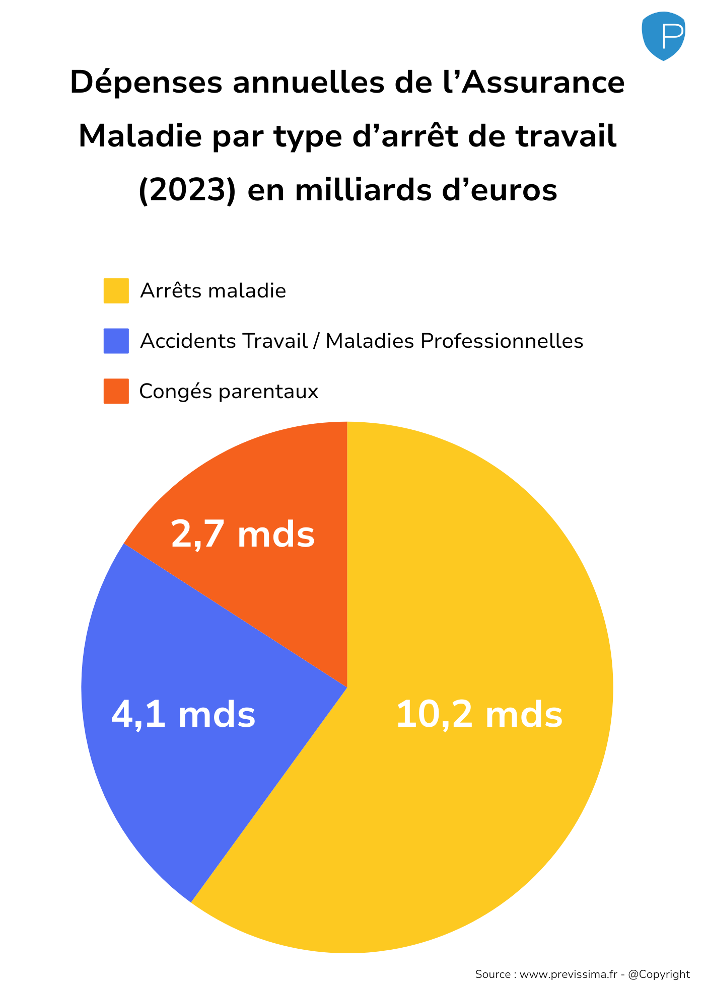 C’est aussi la catégorie la plus coûteuse : en 2023, les dépenses liées aux arrêts maladie s’élevaient à 10,2 milliards d’euros, contre 6 milliards en 2010. Les arrêts pour accidents du travail et maladies professionnelles (AT-MP) continuent eux d’augmenter, atteignant 4,1 milliards d’euros, tandis que les dépenses liées aux congés maternité/paternité/adoption se stabilisent à 2,7 milliards d’euros, dans un contexte de baisse de la natalité.