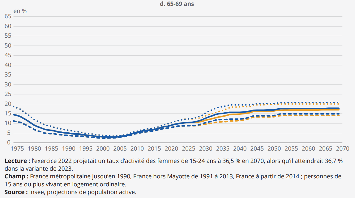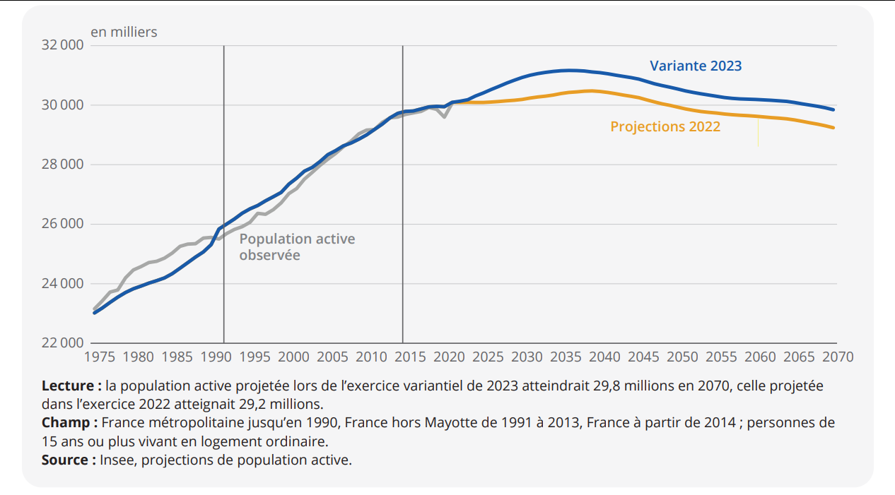 Dans la projection de 2022, c’est-à-dire sans prendre en considération les effets de la réforme des retraites, l’Insee avait prévu un pic de la population active de 30,5 millions en 2039.