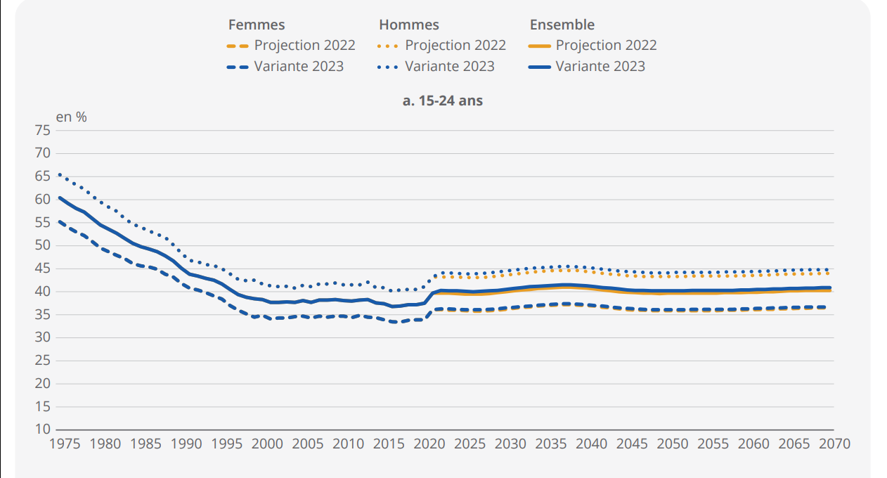 Ainsi, à horizon 2070, le taux d’activité (c’est-à-dire le rapport entre le nombre d’actifs et l’ensemble de la population) augmenterait de :