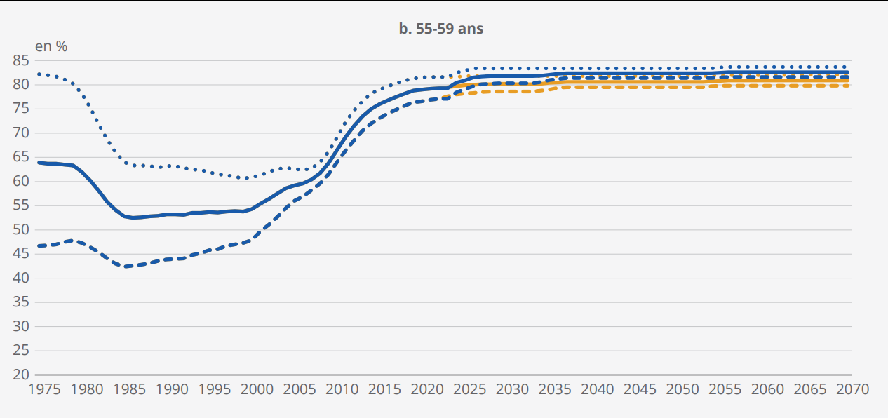 Le recul d’âge d’ouverture des droits à la retraite de 62 à 64 ans, l’allongement de la durée minimale des carrières longues, ainsi que l’augmentation de la durée de cotisation de 42 à 43 ans influencent directement la taille de la population active projetée.