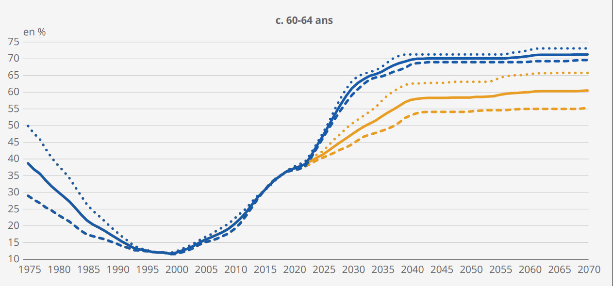 - Et de 10,9 points pour les 60-64 ans : avec une différence considérable entre les femmes, 14,3 points et les hommes, 7,3 points.