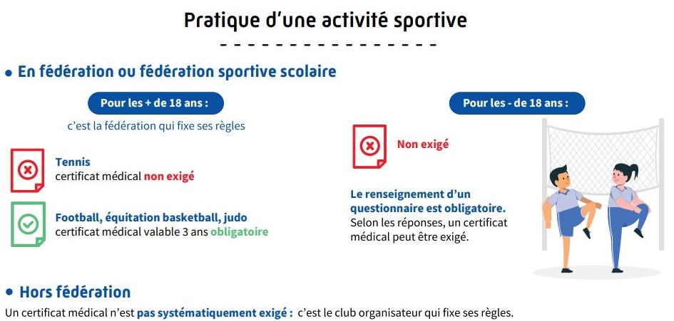 - Certificat médical valable 3 ans obligatoire exigé pour les fédérations de : football, équitation, basketball, judo.