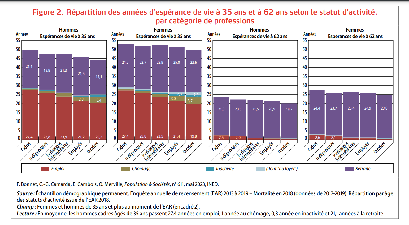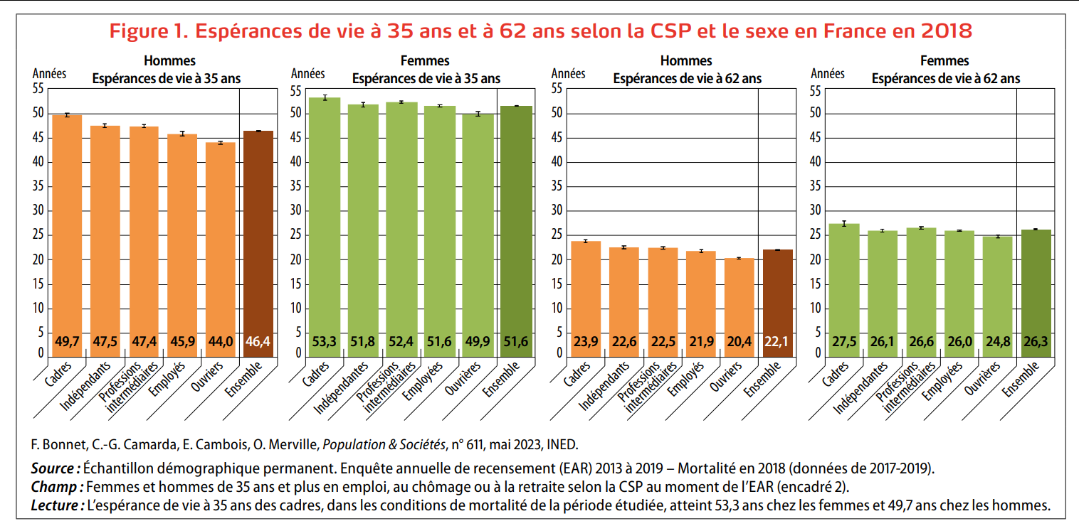 Alors que le calendrier de la réforme se resserre, l’étude publiée par l’INED en mai 2023 souligne la place importante des inégalités sociales face à la mort et de facto, les écarts dans les chances d’atteindre l’âge de départ à la retraite ainsi que les différences de durées passées à la retraite.