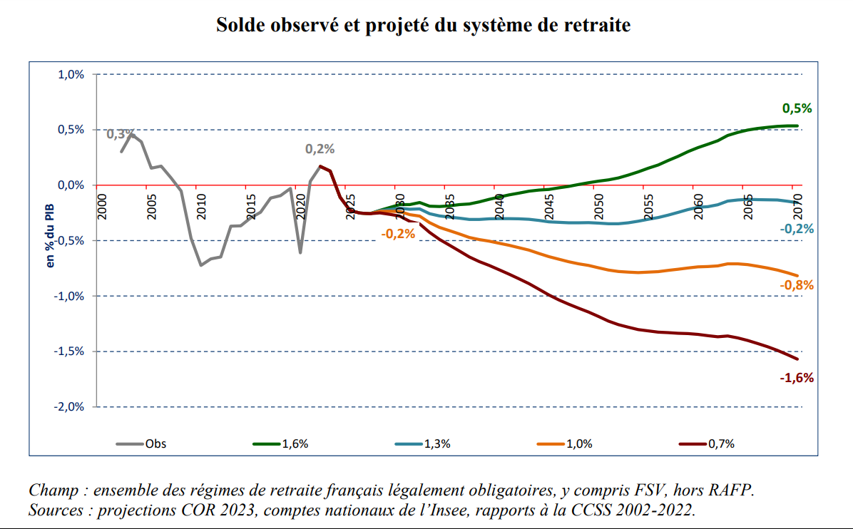 - À compter de 2030, elles oscilleraient entre 11,4 % et 13,9 % selon le scénario. Baisse qui signifie qu’ « il faudra consacrer une part moindre de la richesse nationale au financement public des retraites par rapport à ce qui était anticipé avant la réforme » ;