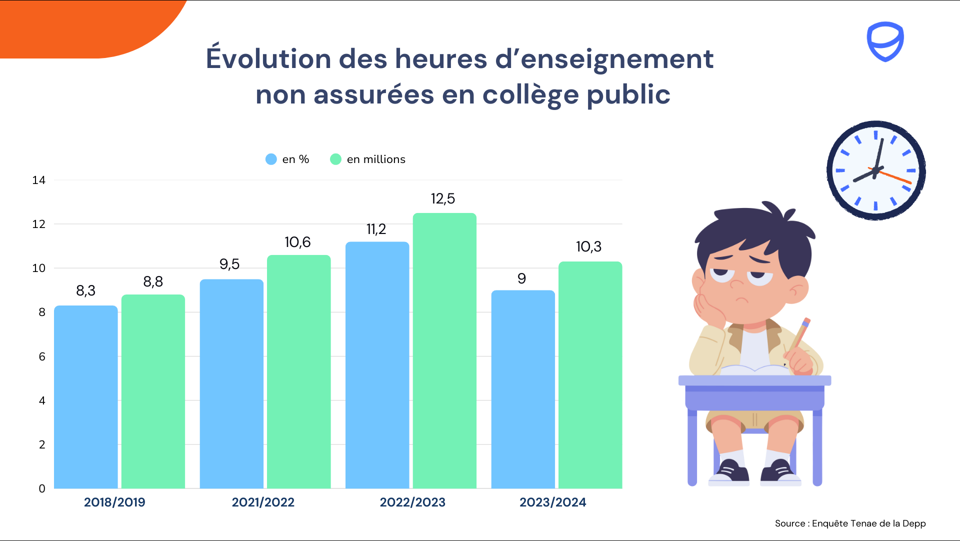 En raison de toutes ces absences, et notamment celles pour raisons médicales, 10,3 millions d’heures d’enseignement n’ont pas été assurées en 2023-2024 dans les collèges publics, soit 9 % des heures, indique le rapport.