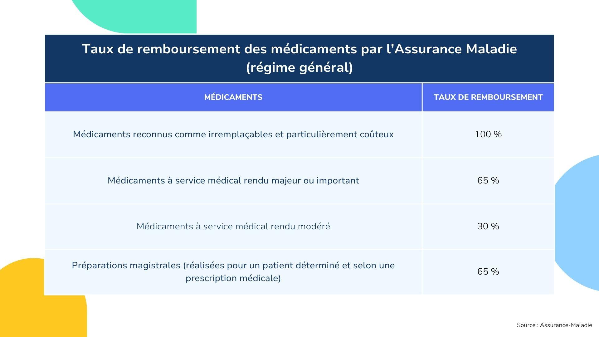 - L’achat de médicaments, dont les remboursements varient de 30 à 100 % selon les cas. En imaginant 300 euros de dépenses annuelles et le plus bas remboursement par l’Assurance Maladie (30 %), il resterait donc 210 euros à sa charge.