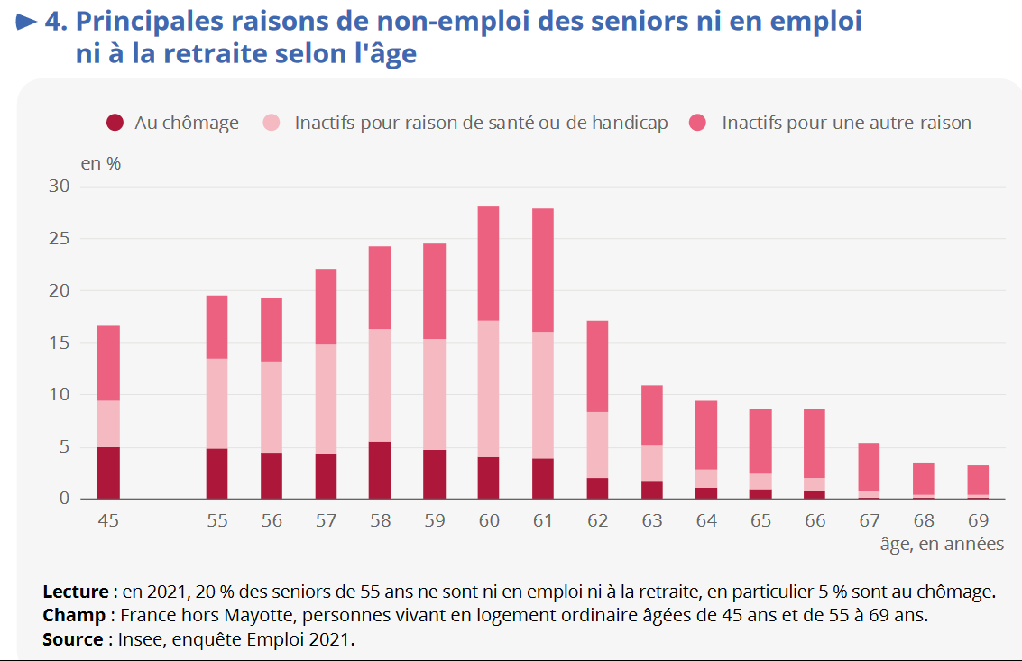 En 2021, en France (hors Mayotte), 16 % des seniors âgés entre 55 et 69 ans ne se trouvaient « ni en en emploi, ni à la retraite » en 2021. Ils étaient soit au chômage (3%), soit inactifs sans percevoir de retraite (13%). Chiffre en hausse de 2% depuis 2014.