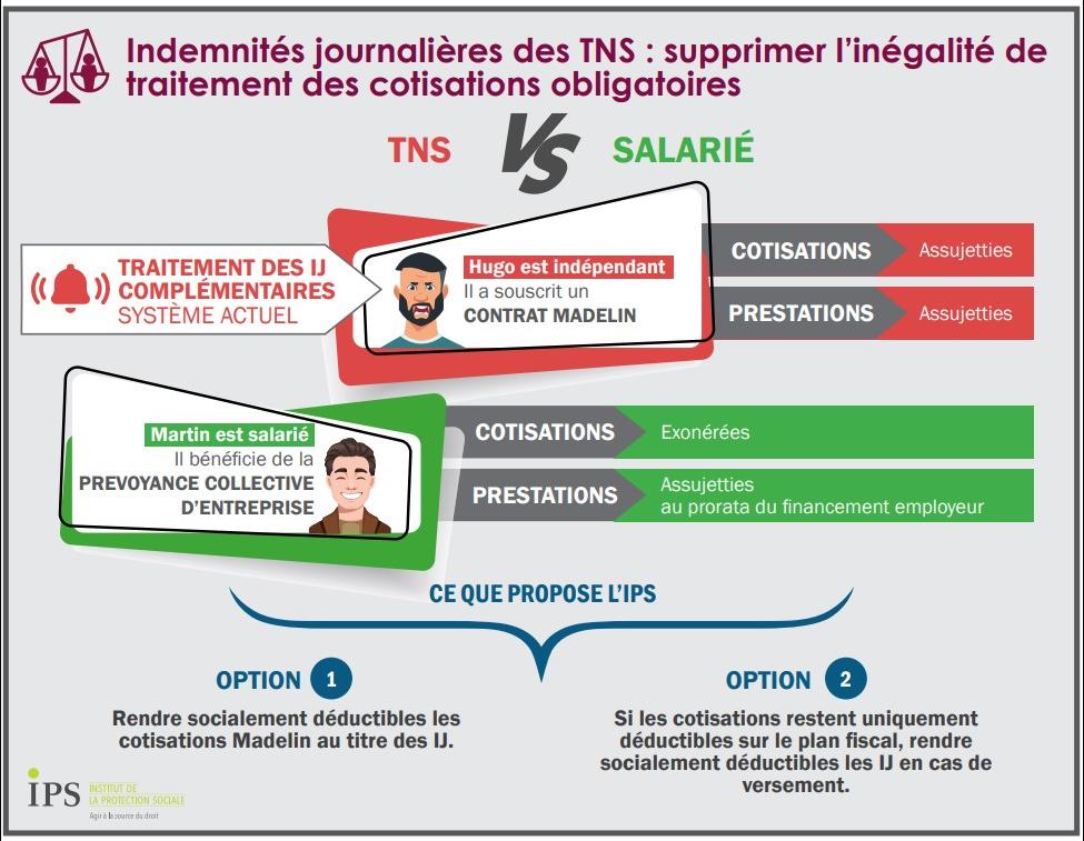 Cela donne lieu à une situation inéquitable à laquelle l’IPS propose de remédier en rendant ces indemnités journalières déductibles, aussi bien sur le plan fiscal que social. A défaut, si elles restent déductibles uniquement sur le plan fiscal, l’IPS préconise qu’elles le soient également socialement lorsqu’elles sont versées.