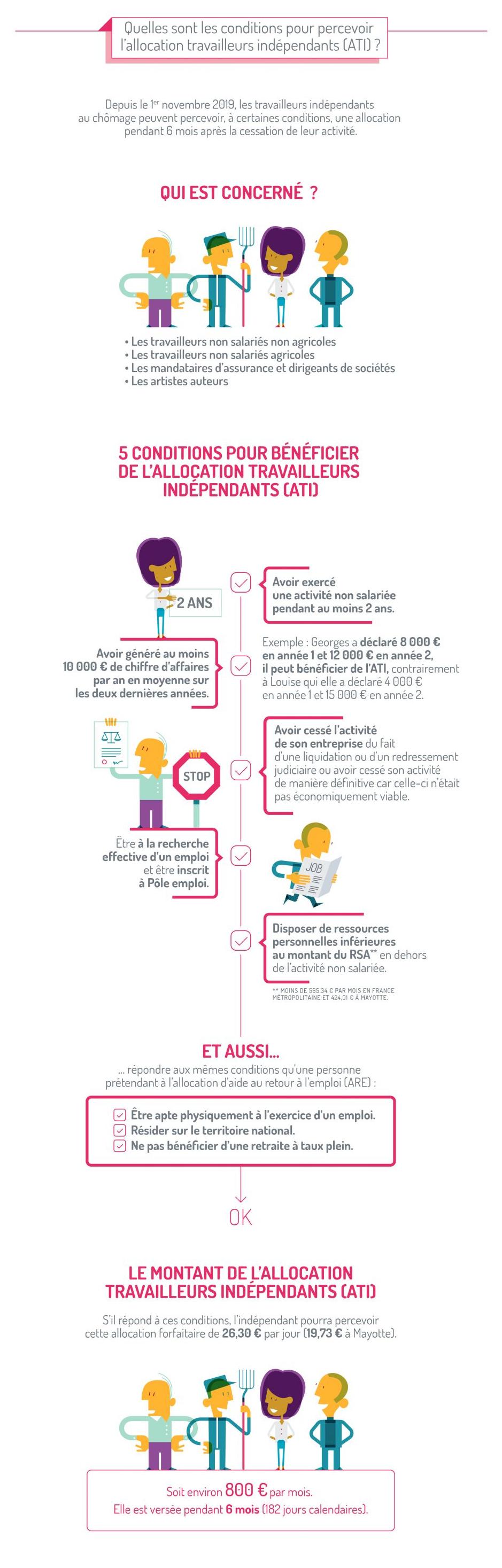 Depuis le 1er novembre 2019, les travailleurs indépendants ont droit à une allocation chômage dédiée : l'allocation chômage des travailleurs indépendants (ATI). Son accès est soumis au respect de certaines conditions cumulatives. Découvrez l’essentiel à connaître sur l’ATI dans l’infographie ci-dessous :