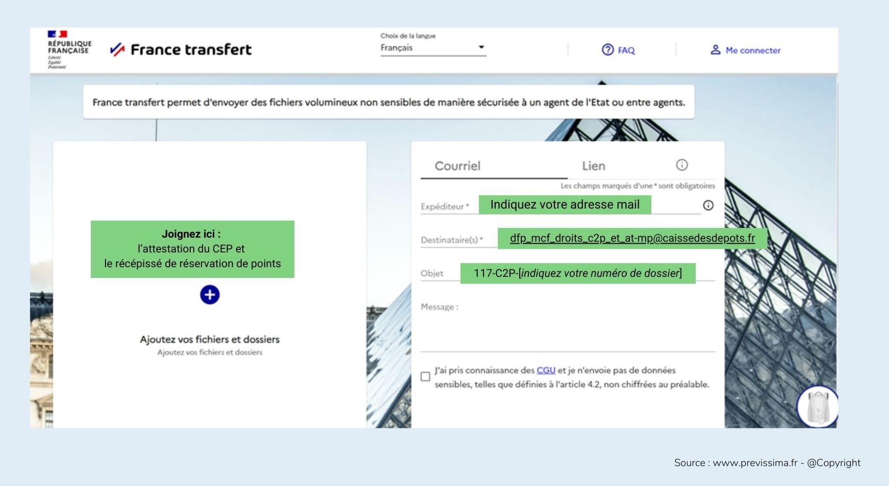 - Suivez les étapes, puis renseignez comme destinataire le mail suivant dfp_mcf_droits_c2p_et_at-mp@caissedesdepots.fr