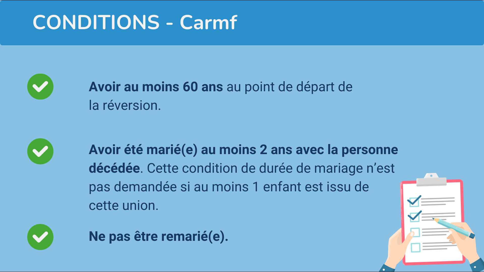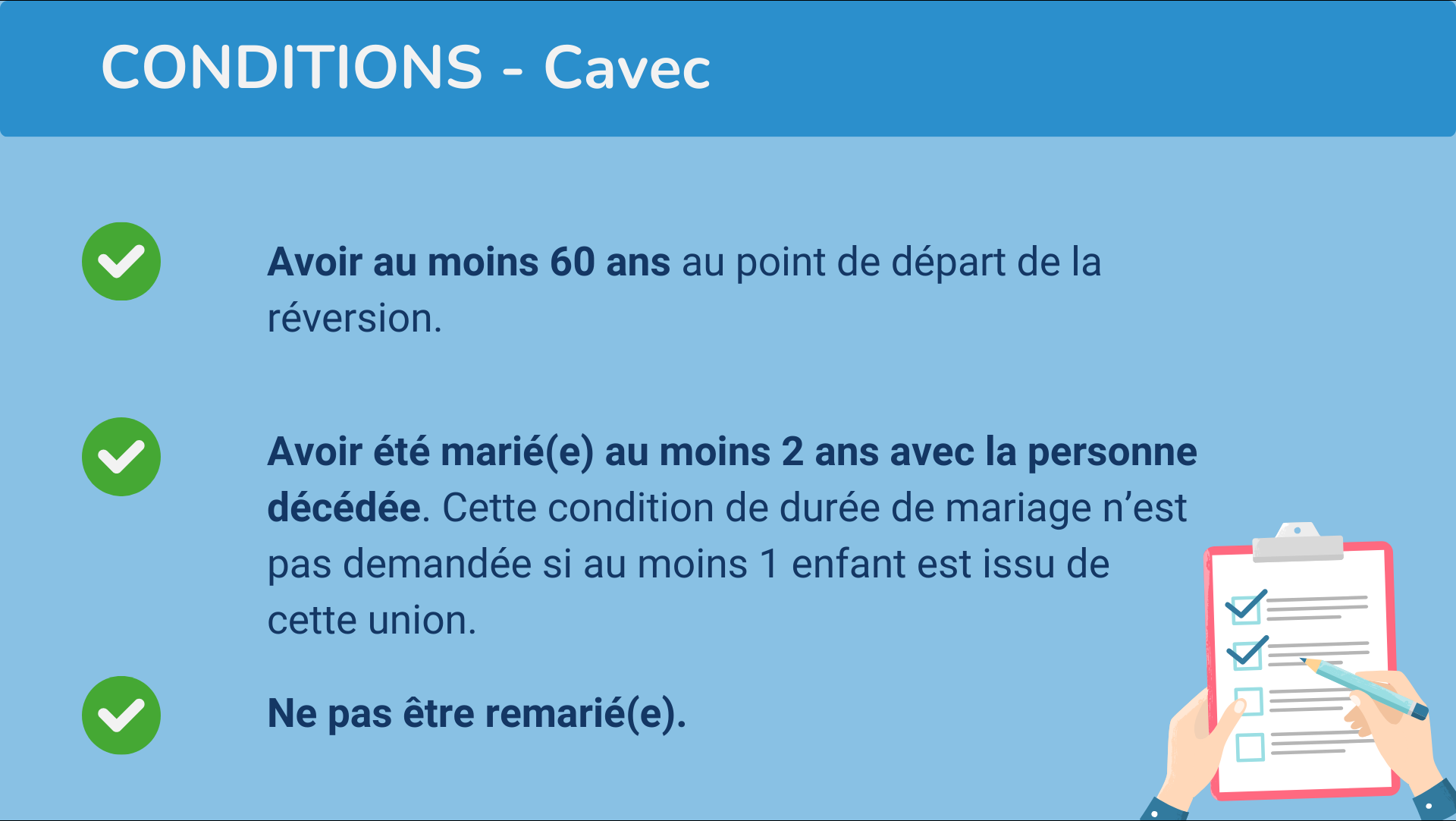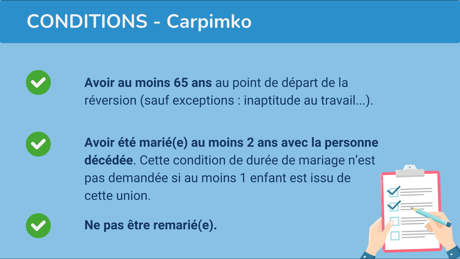Vous devez avoir été marié(e) avec la personne décédée. En revanche, contrairement à certains régimes de retraite complémentaire, aucune condition de durée de mariage n’est requise.
