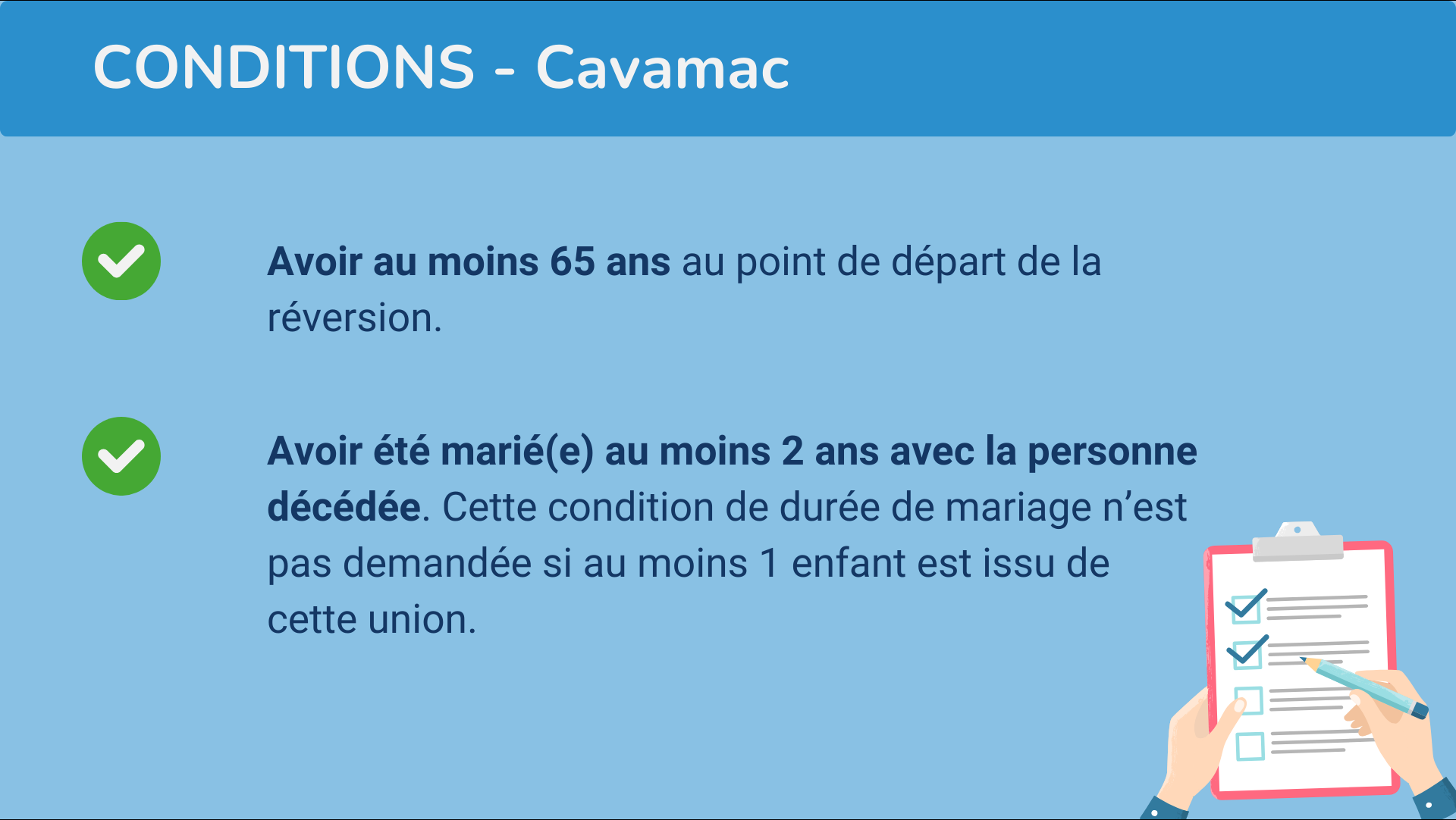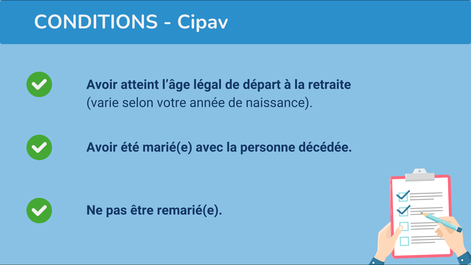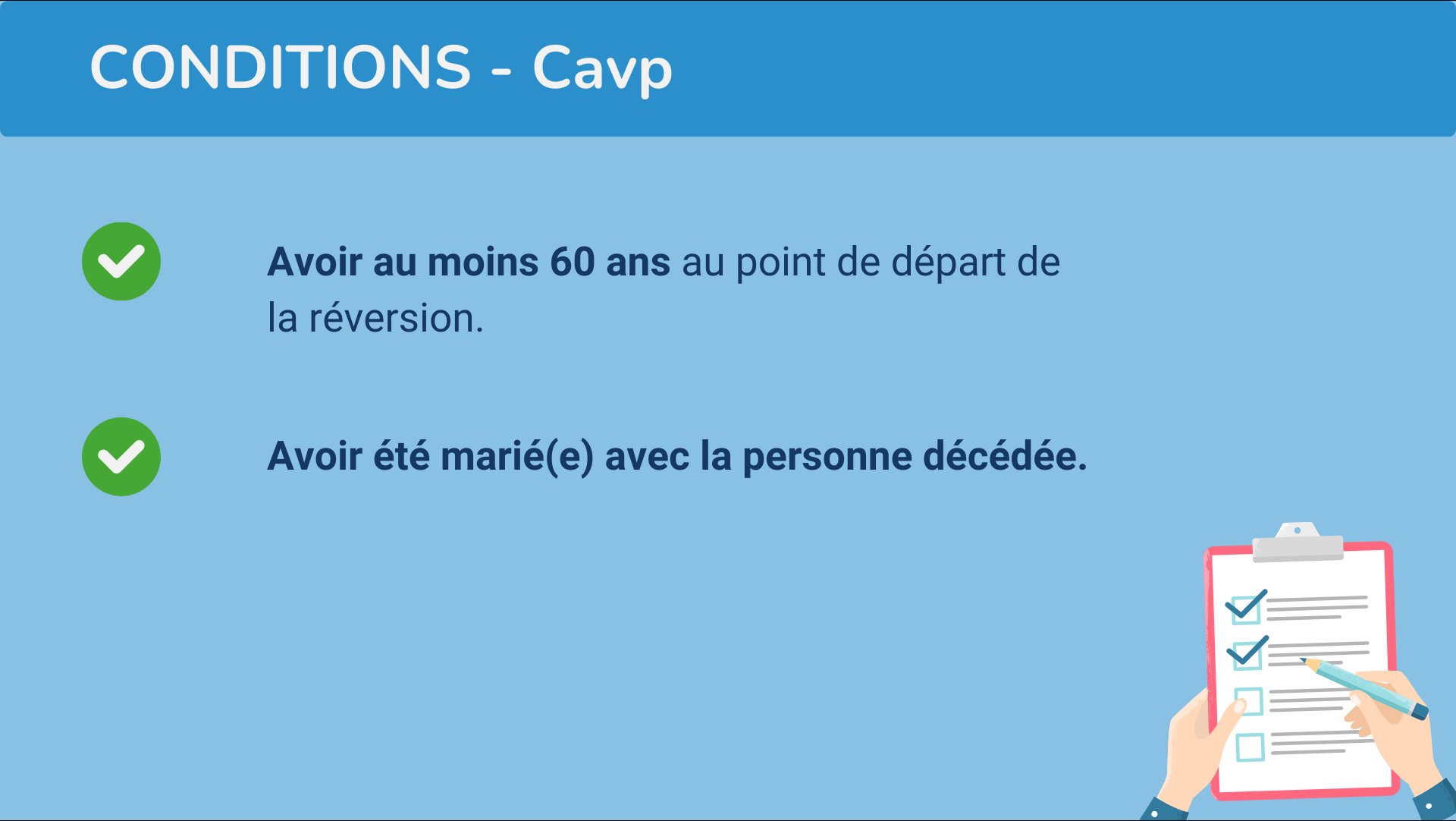 Vous devez avoir été marié(e) avec la personne décédée. En revanche, contrairement à certains régimes de retraite complémentaire, aucune condition de durée de mariage n’est requise.