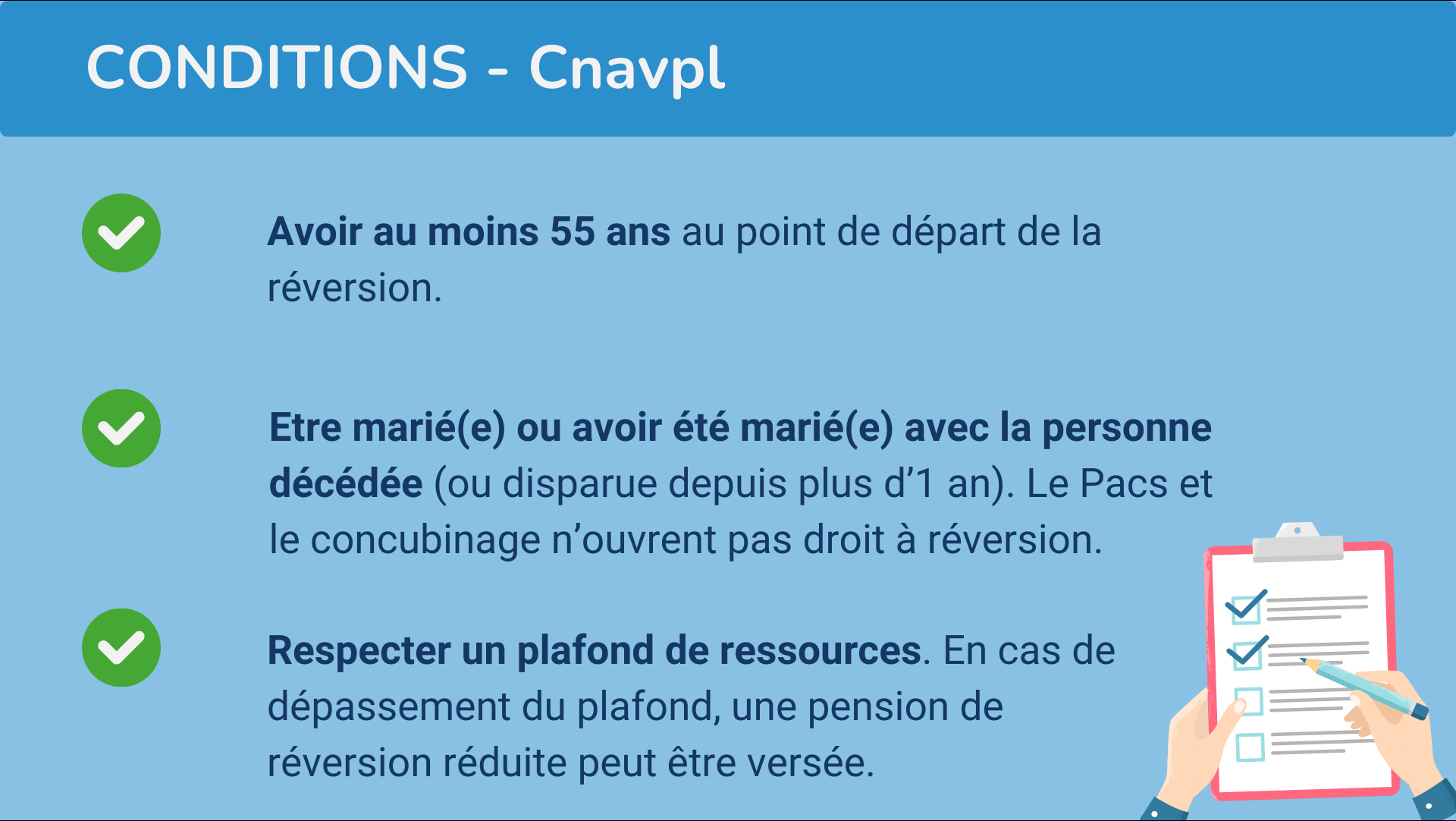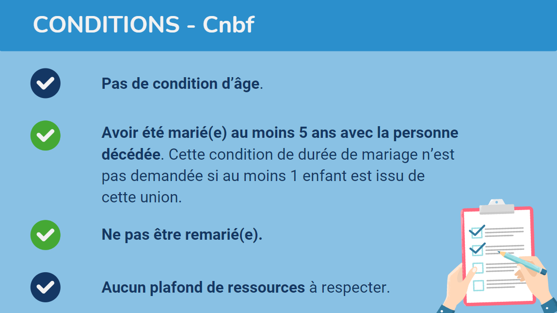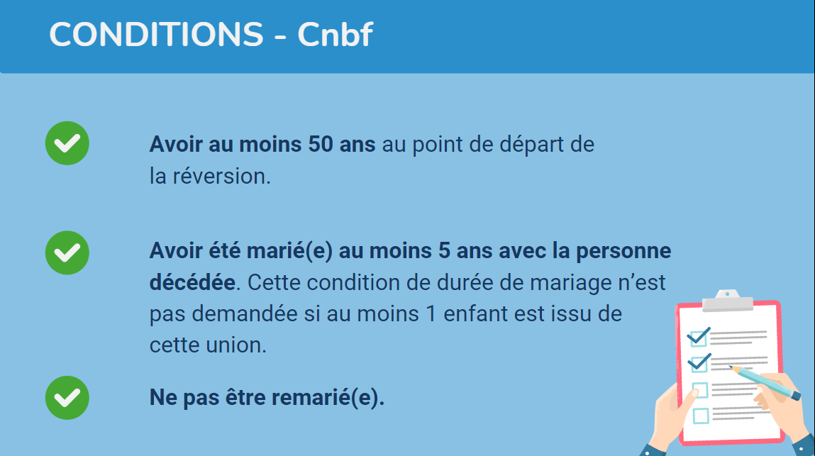 Vous pouvez obtenir une pension de réversion, sous couvert de remplir certaines conditions, à savoir :