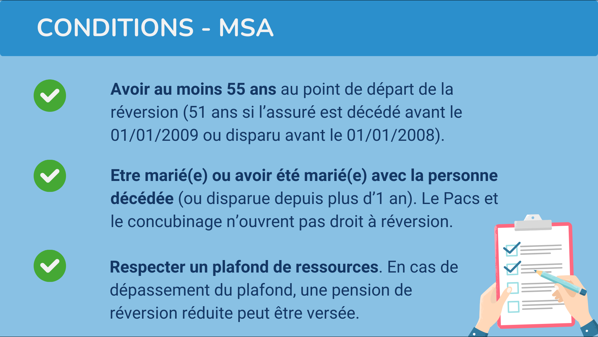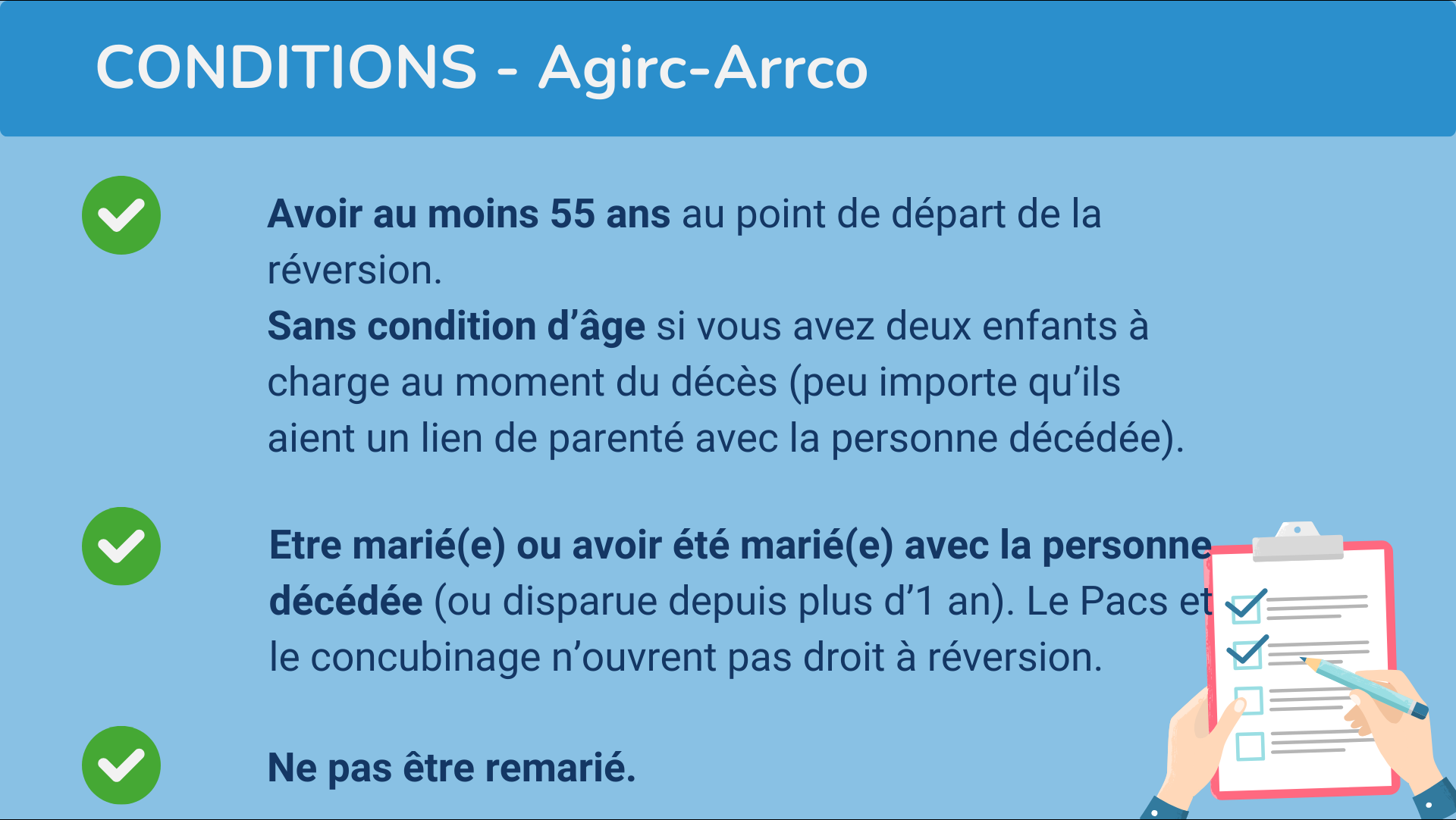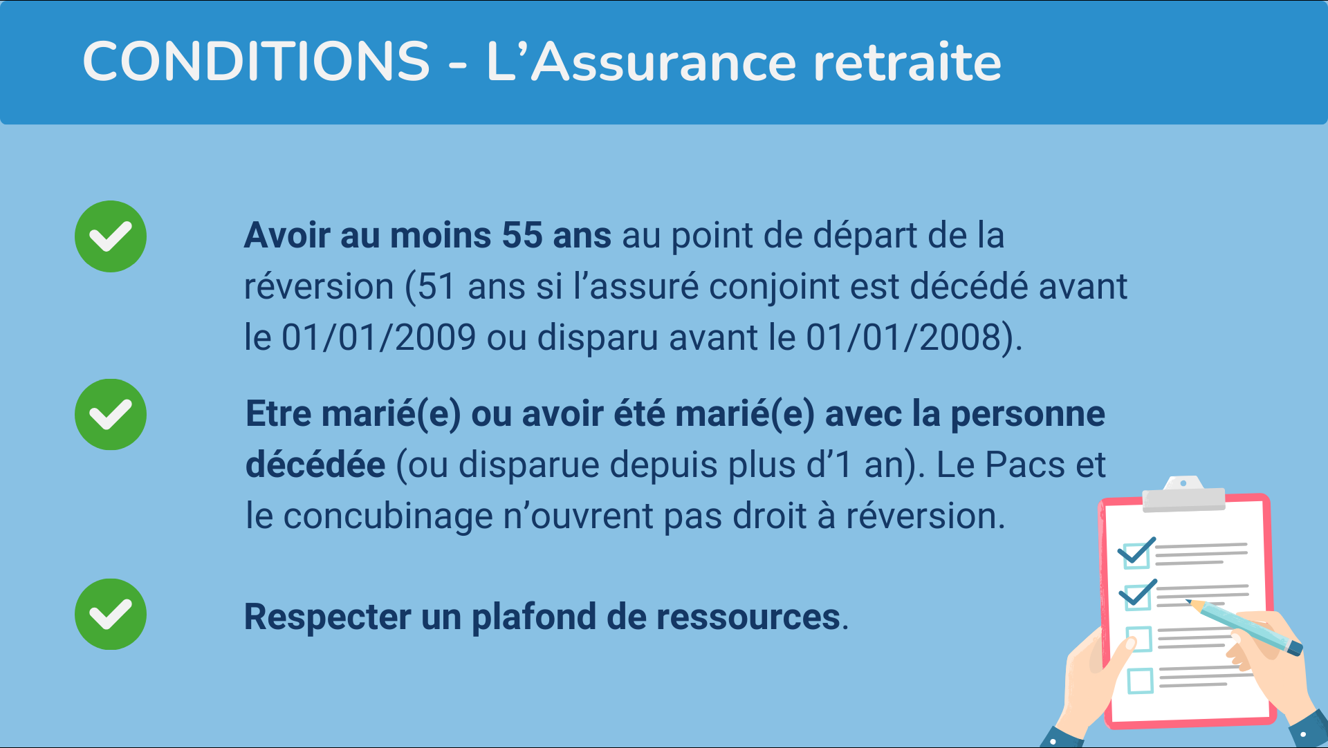 Vous pouvez obtenir une pension de réversion, sous couvert de remplir certaines conditions, à savoir :