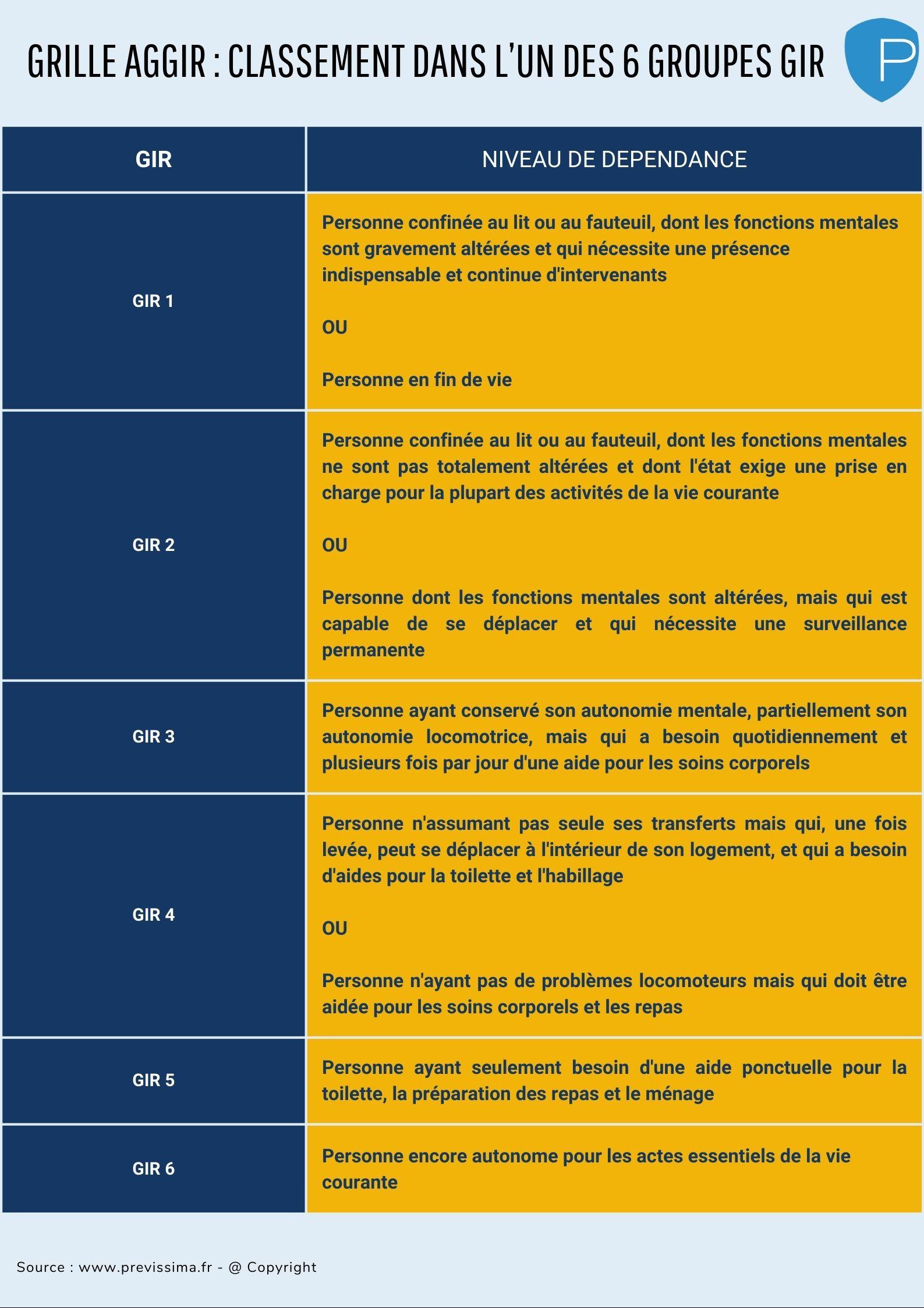 Les niveaux de dépendance de la grille AGGIR sont classés en 6 groupes dits « iso-ressources » (GIR). À chaque GIR correspond un niveau de besoins d'aides pour accomplir les actes essentiels de la vie quotidienne (AVQ).