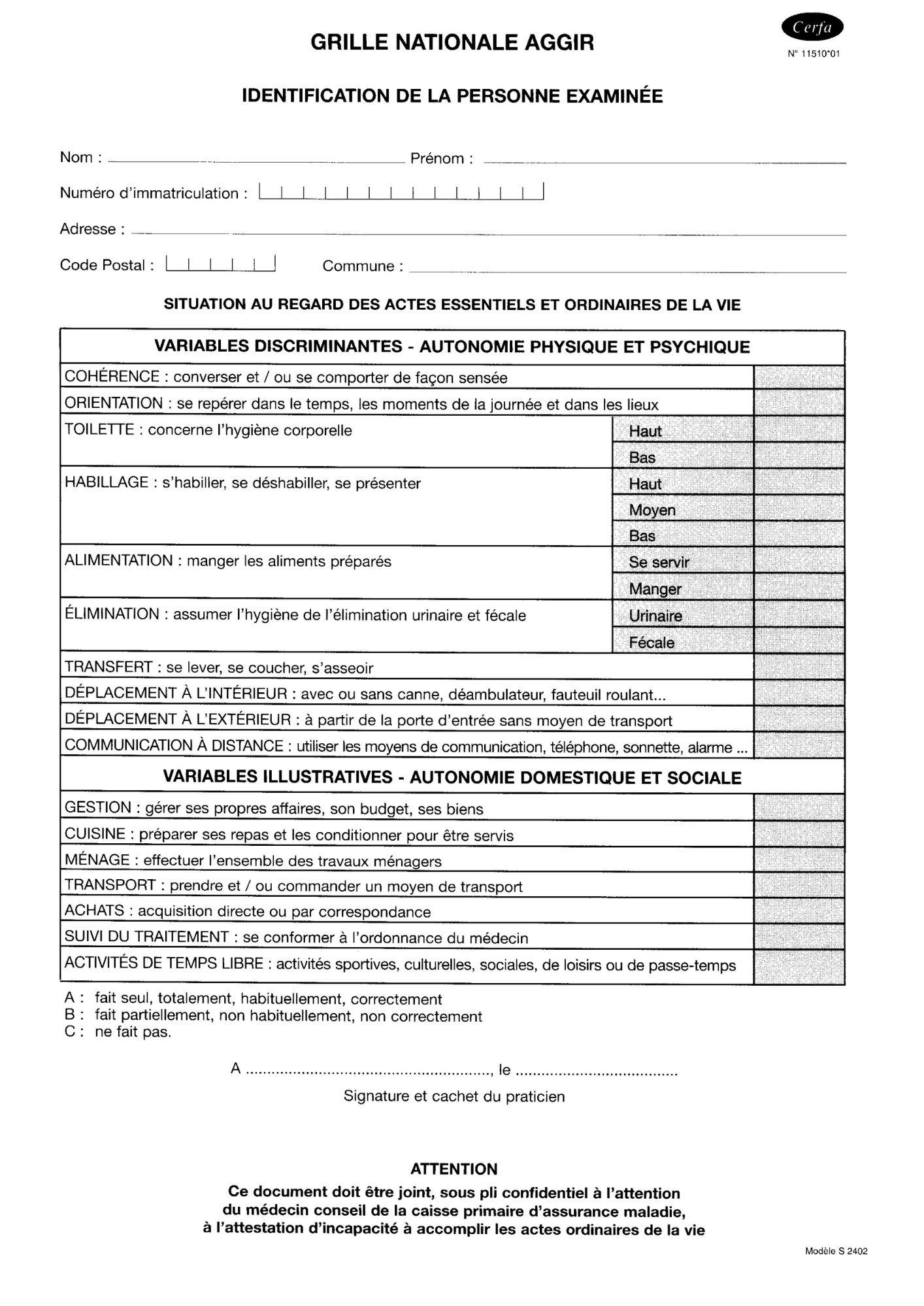 La grille AGGIR se présente sous la forme d'un document à remplir, le formulaire cerfa n°11510*01 « Grille nationale AGGIR », téléchargeable en ligne.