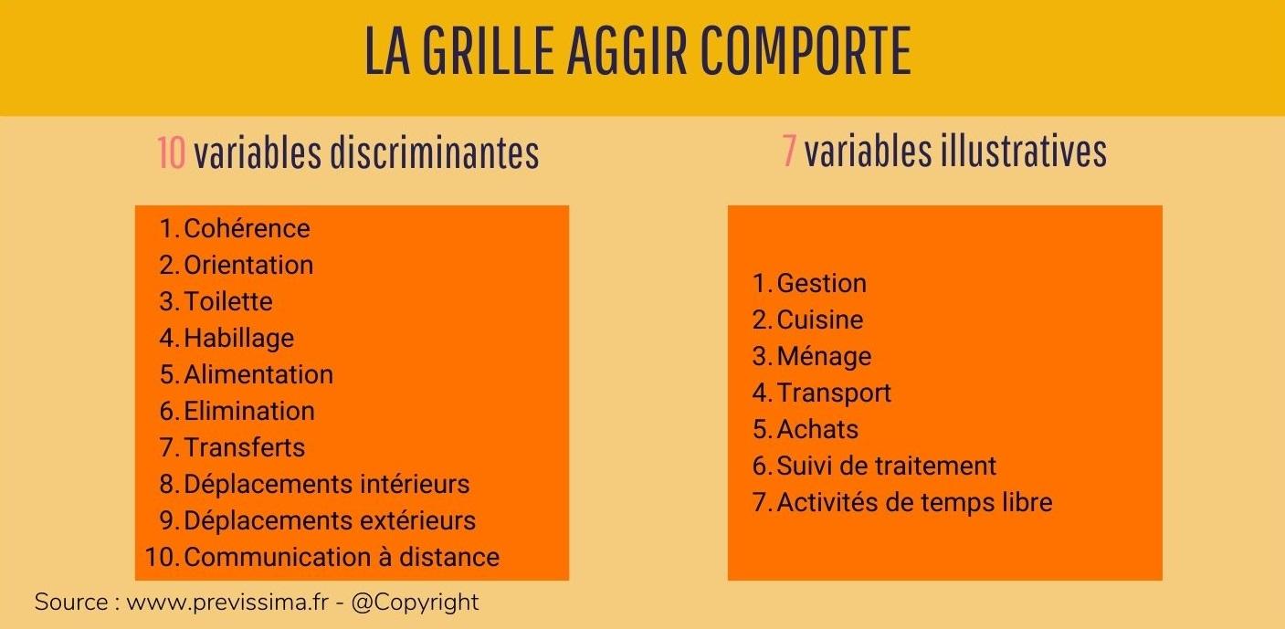 La grille AGGIR comporte de 17 rubriques, appelées variables. Ces variables mesurent les capacités de la personne âgée à accomplir :