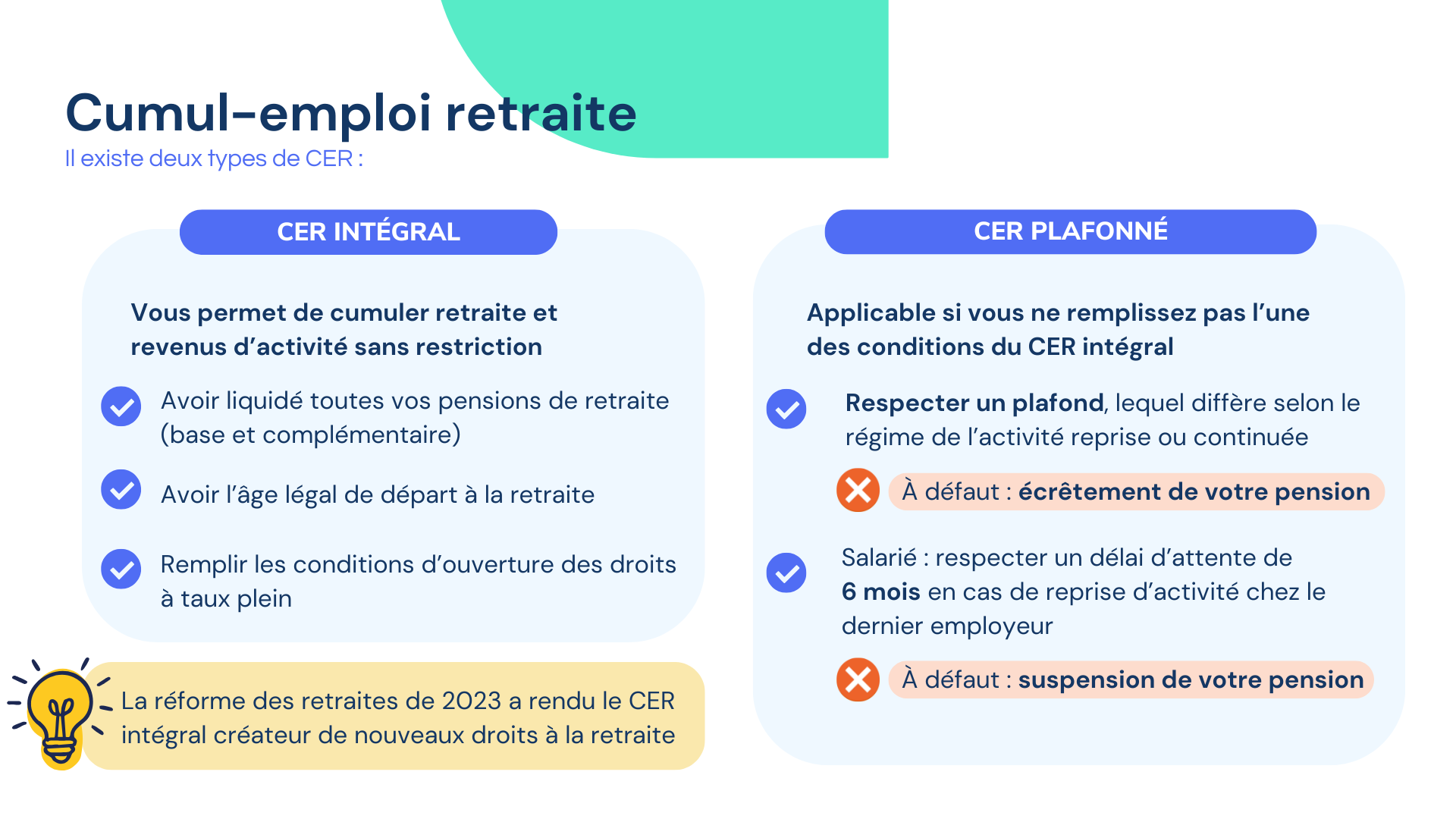 - Et le cumul emploi retraite plafonné, aussi appelé cumul emploi retraite partiel. Vous pouvez y accéder dès lors que les conditions permettant d’accéder au CER intégral ne sont pas remplies :
