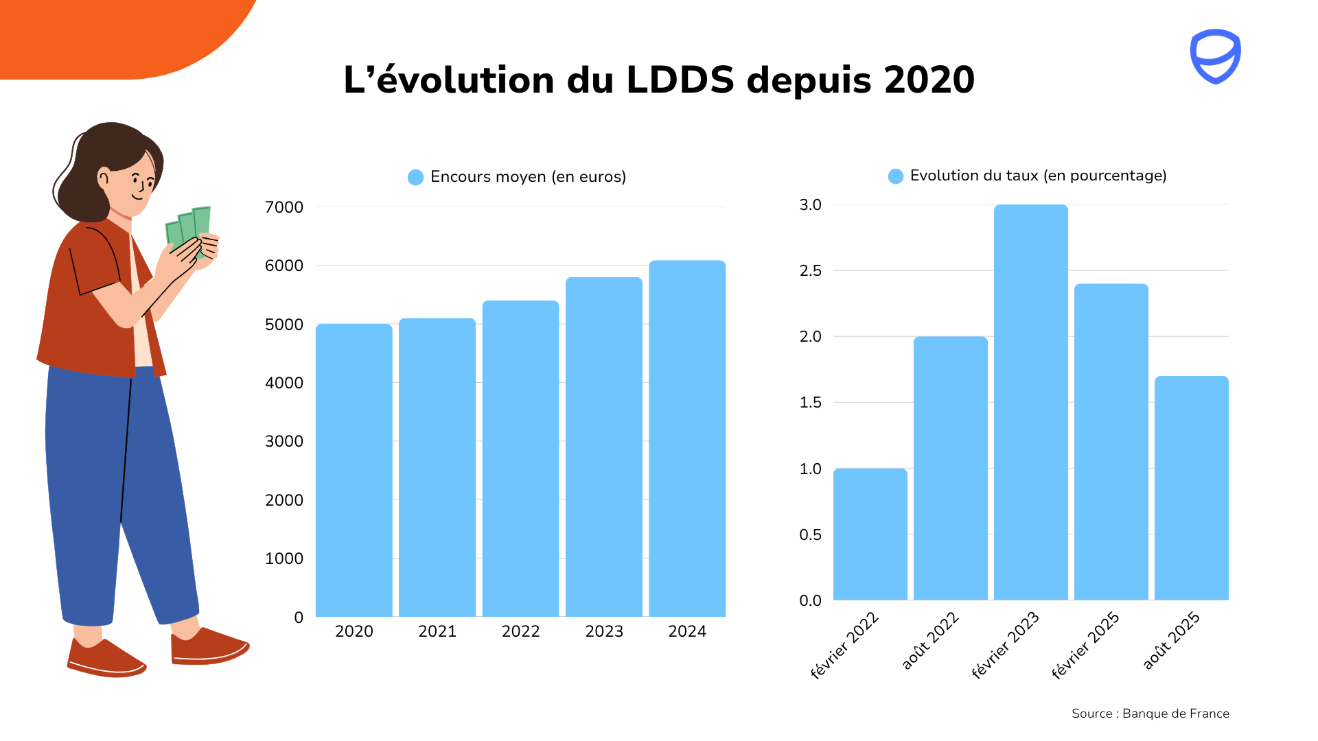 Depuis le 1er août 2025, le taux du LDDS (identique à celui du Livret A) a été fixé à 1,7 %. Ce taux est valable jusqu’au 31 janvier 2026, date à laquelle il pourra être révisé à la hausse, à la baisse, ou maintenu.