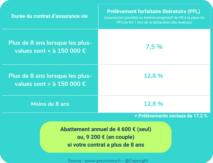 Les primes versées après le 27 septembre 2017, sont imposés en deux temps, lors de votre rachat au prélèvement forfaitaire non libératoire (PFNL) au taux de :